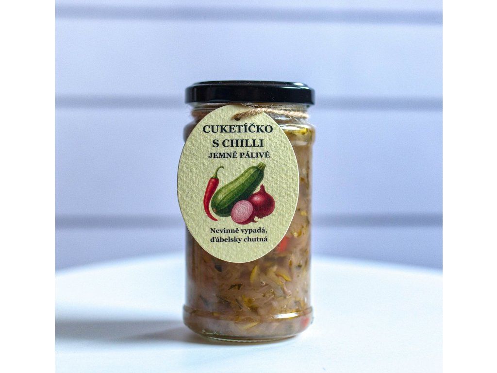 Složení: cuketa, červená cibule, chilli paprička, ocet kvasný, rostlinný olej, cukr, sůl jedlá