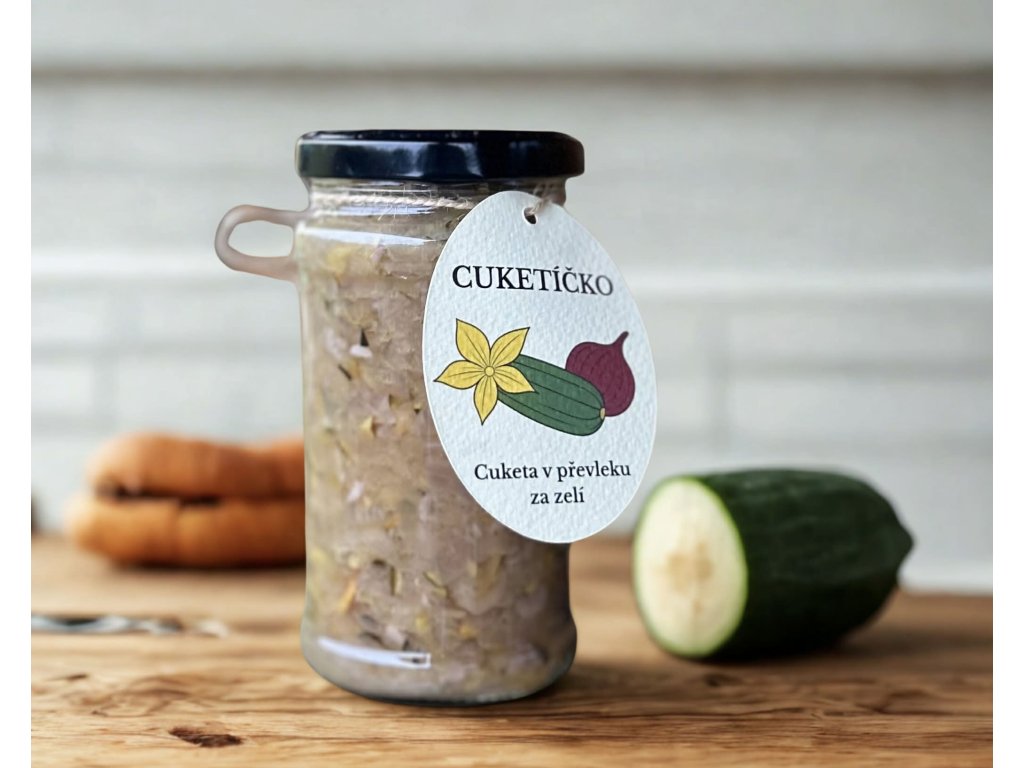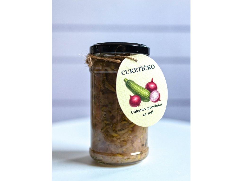 Zelí, které vlastně není zelí. Cuketíčko je naše domácí specialita z křehké cukety a červené cibule, naložená v jemně sladkokyselém nálevu s kapkou oleje. Díky poctivé přípravě má lehkou svěží chuť, která se hodí téměř ke každému jídlu.