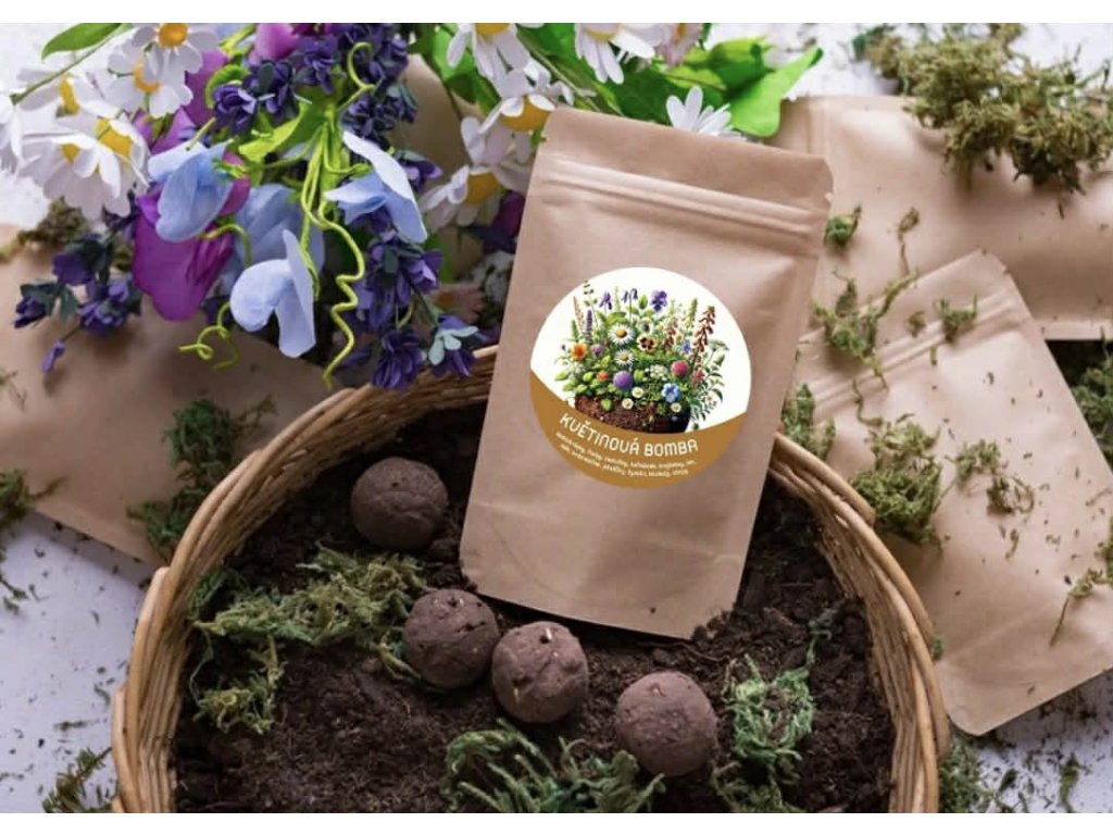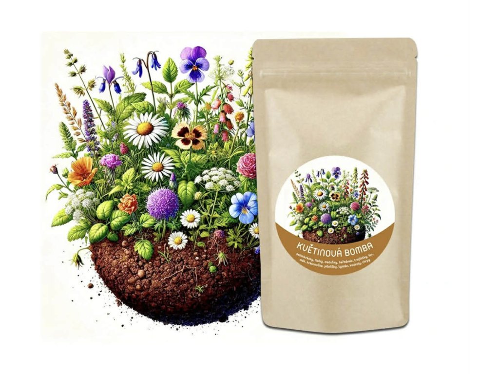 Květinová bomba obsahuje 17 různých druhů rostlinek - jako jsou např. sedmikrásky, fialky, meduňky, heřmánek, trojlístky, len, mák, krásnoočka, jetelíčky, tymián, koukoly, chrpy a mnoho dalších. Každý květinový druh přinese své jedinečné kouzlo a příjemnou vůni.