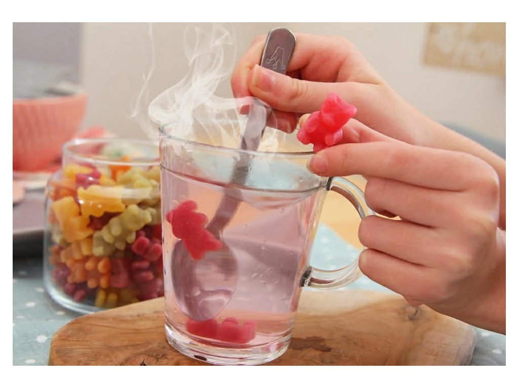 Složení: cukr, glukózový sirup, voda, med (2,9%), želatina, kyselina citrónová, aroma, extrakt z bílého čaje1%, rostlinný výtažek (světlice barvířská, červená ředkev), karnaubský vosk.