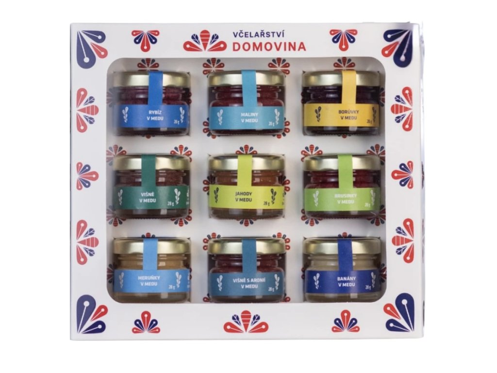 Do dárkové krabičky z papíru jsme zabalili 9 oblíbených, lahodných medů ze sady Ovocné mámení: