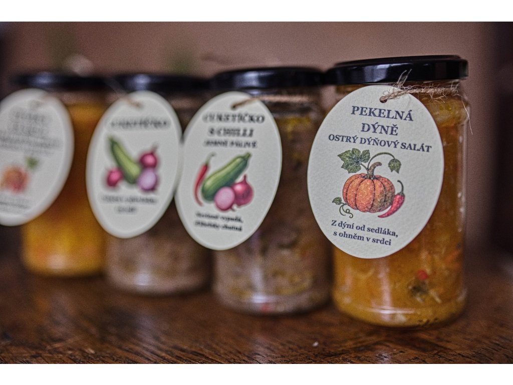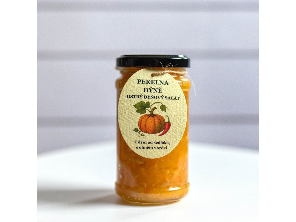 Složení: dýně, mrkev, cibule, chilli paprička, ocet kvasný, rostlinný olej, koření – nové koření cukr, sůl jedlá