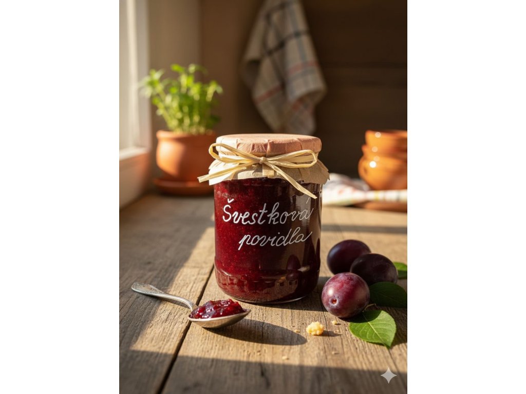SLOŽENÍ: švestky(91%), cukr, kardamom, skořice, hřebíček, badyán, citronová kůra, rum.
