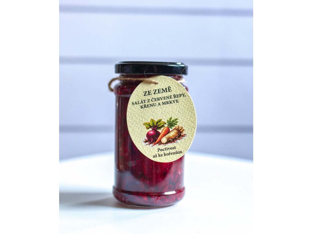 Poctivost až ke kořenům. Červenou řepu, mrkev a křen nastrouháme, zalijeme lehce sladkokyselým nálevem a šetrně zavaříme. Vznikne svěží, křupavý salát, který se hodí ke každému jídlu.